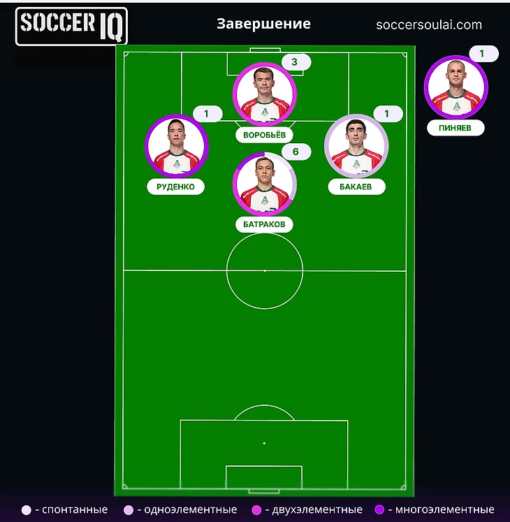 В 6 из 9 случаев двух и многоэлементные голевые атаки Локомотива начинались длинной передачей из второй зоны (район центра поля) – Ненахов, Сильянов (дважды), Руденко, Бакаев и стандарт Батракова