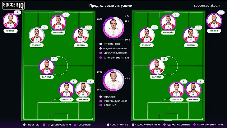 Полностью отсутствуют предшествующие голу игровые ситуации в фазе продвижения только у Пари НН – оба мяча команды забиты после ошибок соперника и подборов. Минимум ситуаций у обоих Динамо (по 3).