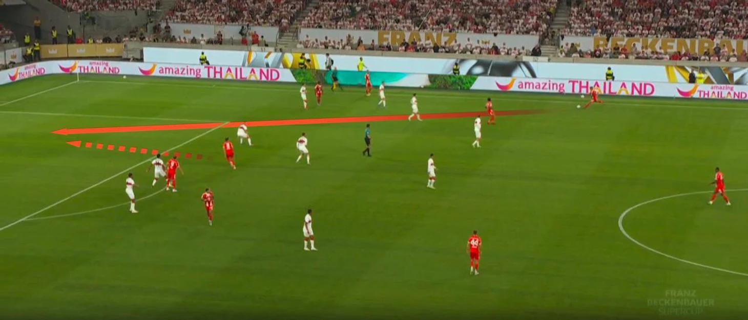 ● Желание проходить поле максимально быстро. «Бавария» и «Штутгарт» редко делали по 10-15 подготовительных передач у своих ворот. Некем делать: больше половины полевых при розыгрышах от ворот располагались высоко, едва ли не на чужой половине. Оттуда часть стартовала в недодачу, другая использовала освободившееся пространство, куда летели забросы/переводы/диагонали. В том числе открывались и правые защитники, Лаймер и Вагноман.