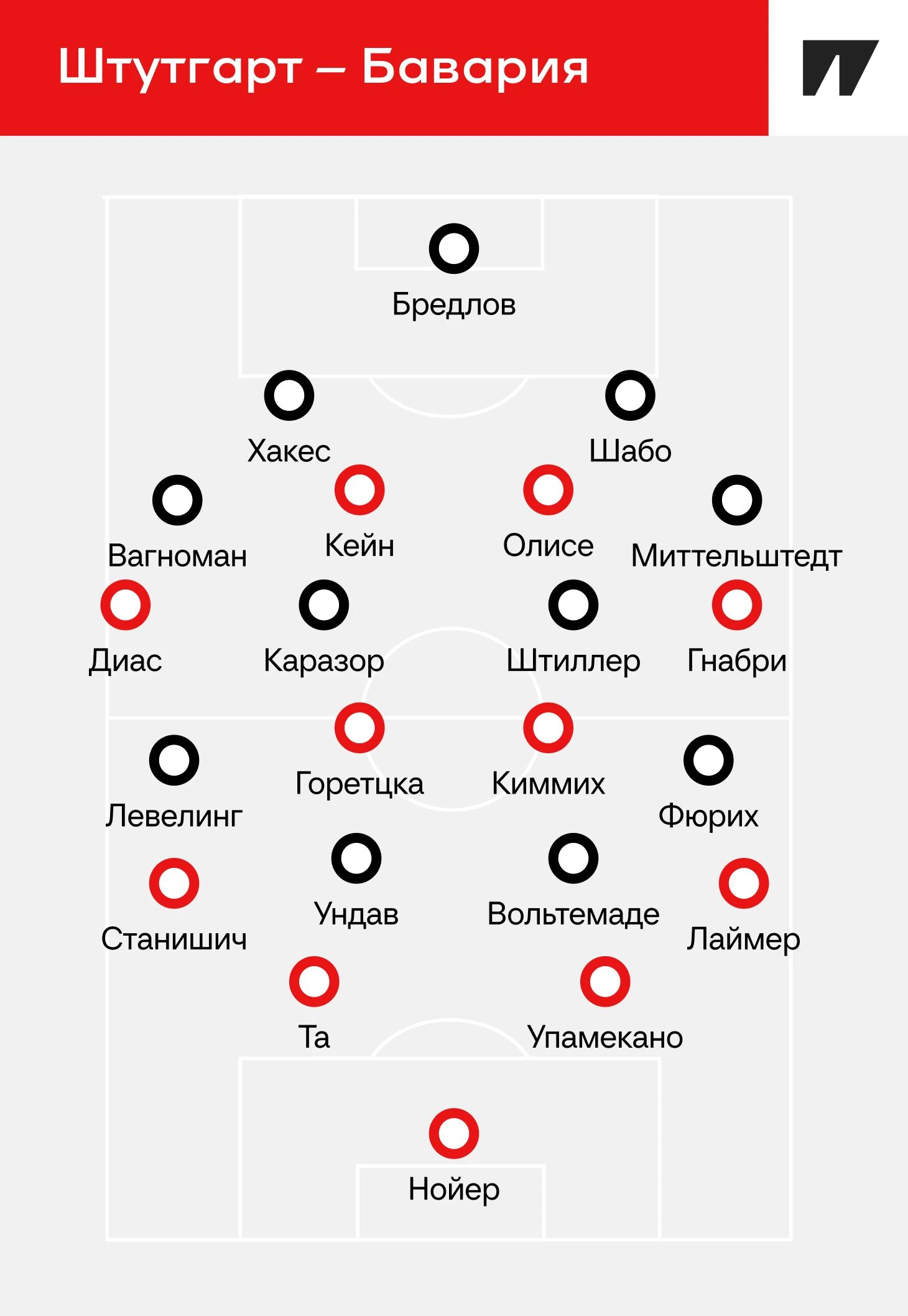 У «Баварии» многое определяют травмы: Альфонсо Дэвис и Хироки Ито одновременно недоступны, поэтому слева на непрофильной позиции играл Йосип Станишич. Пока нет Джамала Мусиалы (и трансферов на вход), десятку исполнял Майкл Олисе, а привычную позицию Олисе закрыл Серж Гнабри. Александар Павлович тоже не мог принять участие – вышел Леон Горетцка. Из тренерских решений: Венсан Компани предпочел новичка Джонатана Та, а не Ким Мин Чжэ.