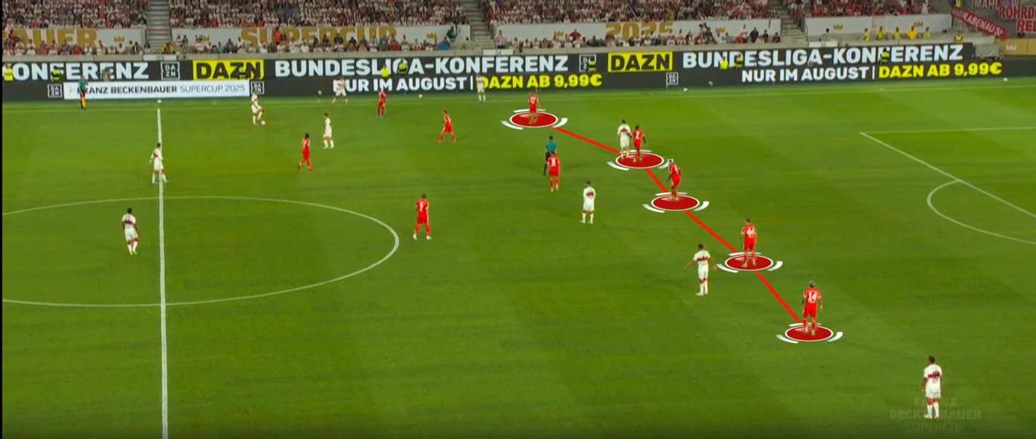 1. Заметно больше игроков, опасных на пространстве. Когда персональная опека ломалась, Олисе, Гнабри, Диас и Кейн улетали в атаку. У Олисе-десятки есть большой потенциал в переходных фазах. В «Штутгарте» нет такого количества резких футболистов, а те, что есть (Вагноман, Левелинг), прямолинейны в финальной трети.