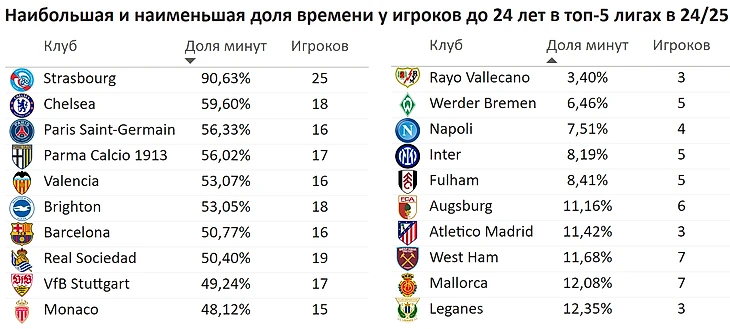 Только в 8-ми командах прошедшего сезона больше половины игрового времени пришлось на игроков младше 24 лет. «Страсбур» абсолютный лидер с 90.63%, также у команды самый низкий средний возраст среди топ-5 лиг (22.8 лет). По окончании сезона отправили в АПЛ троих талантов за 80 млн евро (Дилан Баква, Хабиб Диарра, Мамаду Сарр). Посмотрим, сможет ли клуб-фабрика талантливой молодежи держать высокий уровень и дальше. Следом по уровню доверия молодежи идут финалисты Клубного чемпионата мира: на втором месте «Челси» с 59.6% игрового времени (Палмер, Джексон, Энцо Фернандес) на третьем «ПСЖ» с 56.3% (Баркола, Невеш, Дуэ, Мендеш). Среди клубов Бундеслиги молодежи больше всего доверяет «Штутгарт», в Серии А – «Парма», Ла Лига – «Валенсия». «Барселона», «Брайтон», «Реал Сосьедад» также делают ставку на доверие молодежи. «Монако» на 4-ом месте по среднему возрасту игроков в составе (24.4), а по доли игрового времени у молодежи на 10-м месте. Все топ-10 клубов где было наибольшее доверие молодежи остались в высшей лиги и большинство оказалось в верхней части турнирной таблицы.