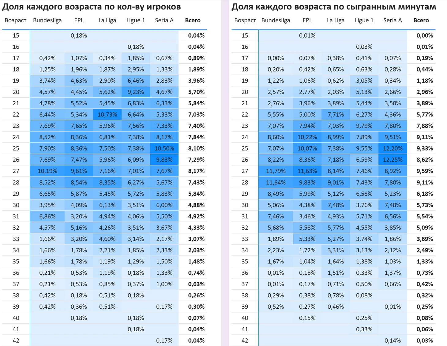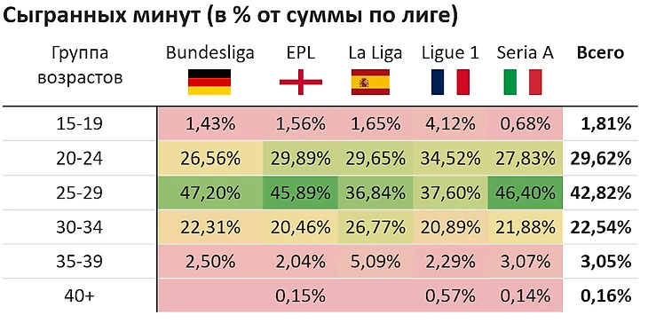 Итоги: Ла Лига сочетает уважение к опыту (самая высокая доля у игроков старше 35 лет), вместе с большим доверем к молодежи. Лига 1- лидер по доверию молодежи (15-24) при умеренном внимании к ветеранам. Бундеслига и АПЛ – делают упор на возраст 25-29, активно полагаясь на зрелых профессионалов. В Серии А – самая высокая доля минут у «пикового» возраста (25-29), при этом минимально используют молодых, зато часто доверяют ветеранам ограниченное игровое время.