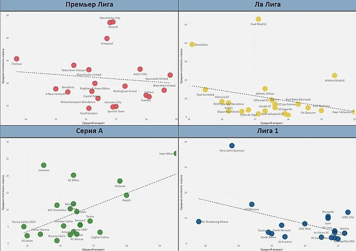 Молодые игроки (20-24 года) в Серии А получают более низкие оценки, чем их ровесники в других лигах (лучшие оценки относительного средних по лиге в АПЛ). Это объясняет, почему молодым футболистам сложно закрепиться в итальянских клубах: высокая конкуренция со стороны опытных игроков не дает им шанса проявить себя. В остальных лигах обратный тренд: чем моложе состав, тем выше средняя стоимость игрока в команде. Однако, в каждой лиге есть выбросы, которые в значительной степени определяют этот тренд: в Серии А – старый и дорогой «Интер», в Лиге 1 – молодой и дорогой «ПСЖ», в Ла Лиге молодая и дорогая – «Барселона», а в АПЛ – «Челси».