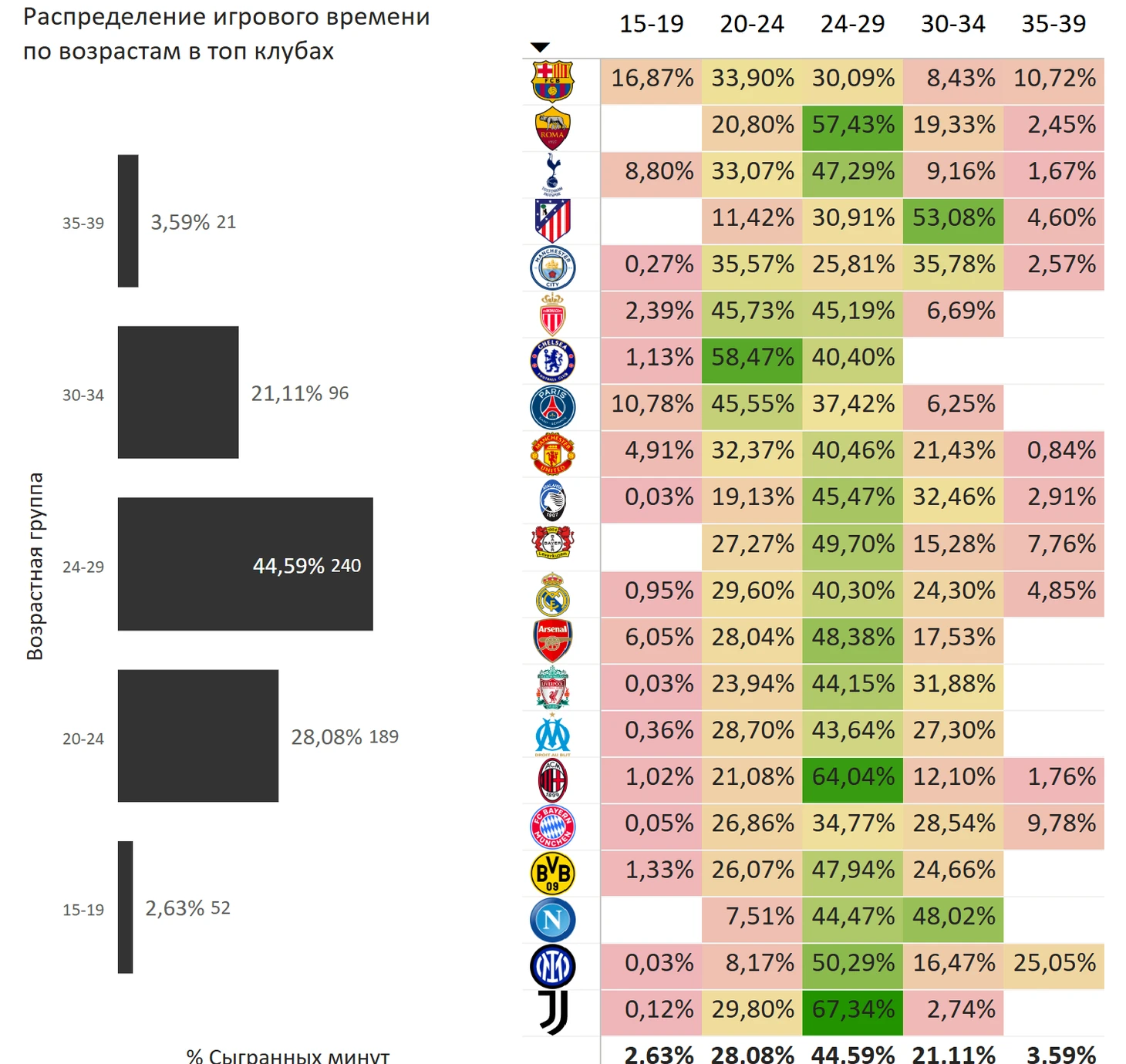 Большинство из представленных топ-клубов (12 из 21) концентрируют максимум времени на возрасте 24-29 лет, три клуба выбирают скорее молодежь («Челси», «ПСЖ», «Барселона»), другие три клуба делают ставку на опыт («Атлетико», «Наполи», «Интер»), а остальные («Манчестер Юнайтед», «Реал», «Манчестер Сити») равномерно распределяют время между разными возрастами, не концентрируясь ни на молодежи, ни на опыте, ни на среднем возрасте.