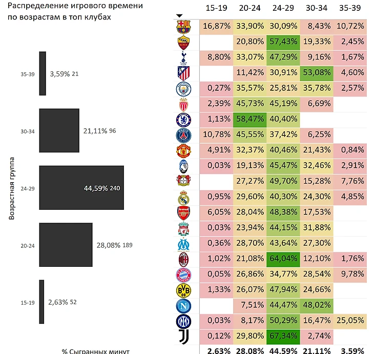Среди топ-клубов (из представленных) средний показатель доли сыгранного времени у игроков в возрасте до 24 лет составил 30.7%. В целом распределение возрастов практически не отличается от общих значенией по всем клубам топ-5 лиг.