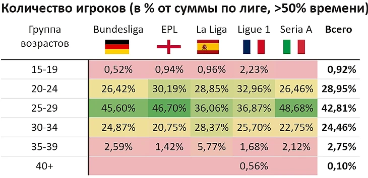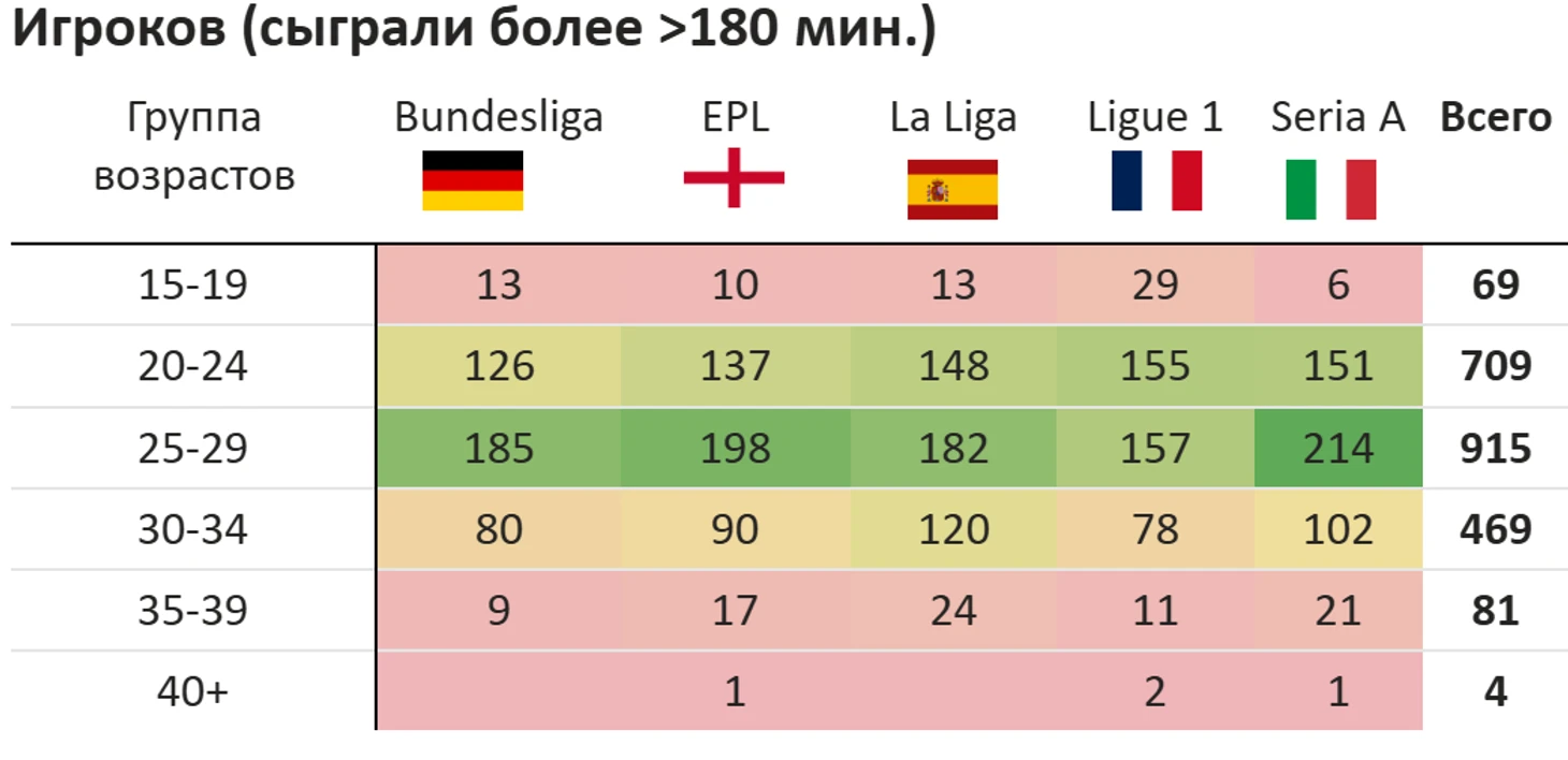 Активнее всего ветеранов используют в Ла Лиге - наибольшая доля по количеству игроков и игрового времени у тех кому страше 35. Клубы АПЛ меньше всех предпочитают ветеранов (за исключением «Фулхэма» и «Вест-Хэма»). Итальянский чемпионат занимает второе место по доле ветеранов (35-39 лет) в составах, но парадокс в другом. По количеству игроков с более чем 50% игрового времени Серия А лишь на четвертом месте, зато по проценту сыгранных минут – на втором. Это означает, что ветераны в Италии редко являются основой команд, но активно используются на замену. Тренеры держат их в заявке для решения тактических задач в концовках матчей, но не строят вокруг них игру с первых минут. Опыт ценится, но дозированно.