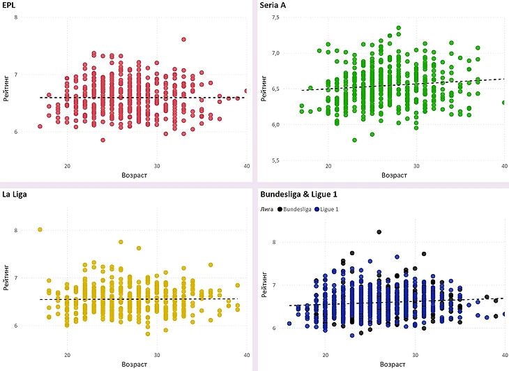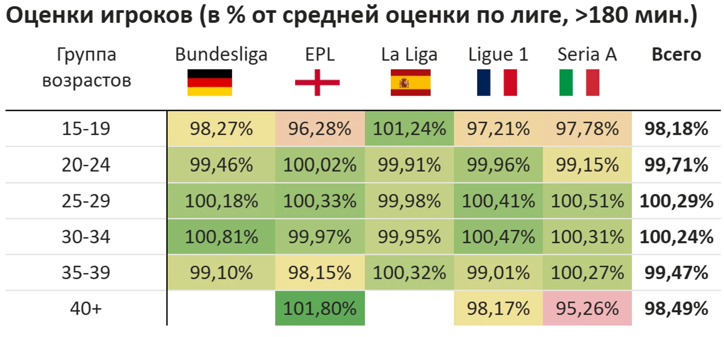 Среди молодых людей в возрасте до 19 лет наивысшие оценки в Ла Лиге – выше средних по лиге на 1.24%, большой вклад внес Ламин Ямаль с феноменальным рейтингом 8.01, это лучший результат среди всех игроков до 24 лет. У игроков до 19 лет худшие оценки в АПЛ – ниже средних по лиге на 3.72%. В возрасте от 20 до 24 лет лучшие оценки в АПЛ – на среднем уровне лиги. В Серии А худшие оценки у игроков в возрасте от 20 до 24 лет. В среднем по всем топ-5 лигам наивысшие оценки в возрасте от 25 до 29 лет, у относительно молодых (20-24) оценки лучше чем у относительно «старых» (35-39): 99.71% vs 99.47% от средних значений по всем лигам. У игроков с 35 до 39 лет лучшие оценки в Ла Лиге, также выше средних по лиге оценки у ветеранов в Серии А. Лучшая оценка среди игроков 35+ у представителя Ла Лиги – Роберт Левандовски с рейтингом 7.27, следом за ним как раз идут представители Серии А – Франческо Ачерби (6.91), Милан Джурич (6.91), Матс Хуммельс (6.89).