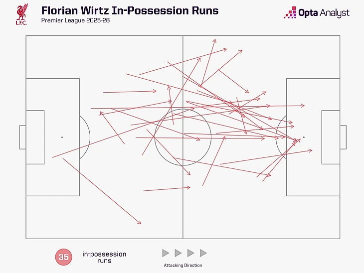 Больше всего пробежал – Флориан Виртц (а говорят, что богатые ленятся). Посмотрите на его карту движения с мячом.