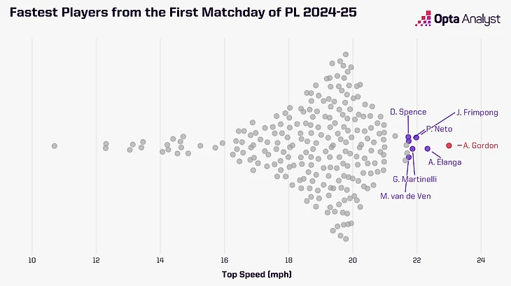 Энтони Гордон – самый быстрый игрок тура. Хавбек «Ньюкасла» будто в «другой» лиге относительно других игроков. Разогнался до 37 км/ч – никто не набрал даже 36. Может ему в легкую атлетику?