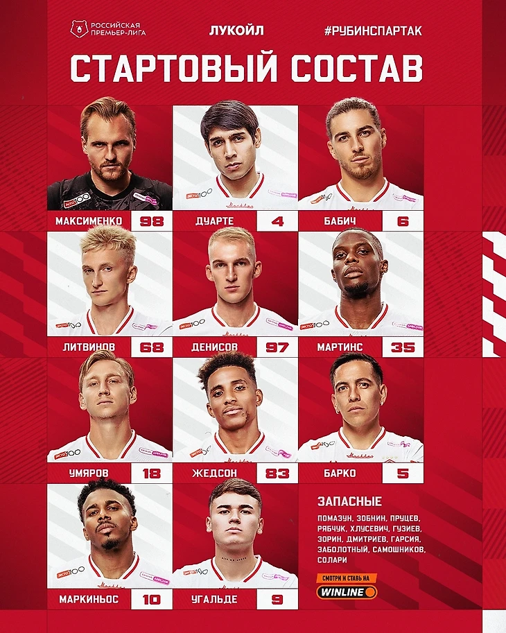 «Спартак»: Максименко (к), Денисов, Дуарте, Бабич (Гузиев, 90+2), Литвинов, Маркиньос (Солари, 46), Умяров, Жедсон, Мартинс (Зобнин, 83), Барко (Дмитриев, 89), Угальде (Гарсия, 89).