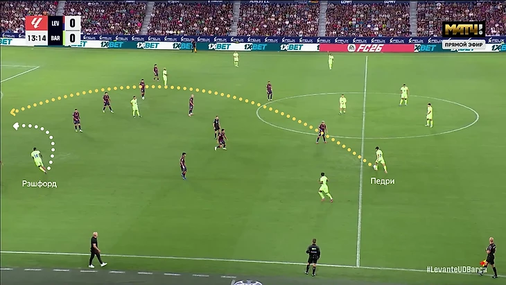 Слева Рэшфорд зачастую стартовал в широкой позиции. Бальде начинал ниже, а полуфланг мог заполнять Педри. По ходу эпизода футболисты могли меняться позициями. В чем была проблема?