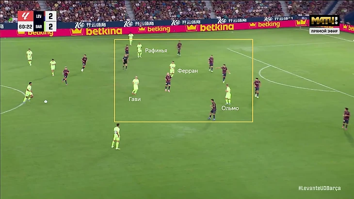 В перерыве немецкий тренер постарался вернуть команду к базовым настройкам. Рафинья вернулся налево, а в правом полуфланге появился Ольмо. В центр поля вместо Касадо вышел Гави, что сделало середину поля более открытой.