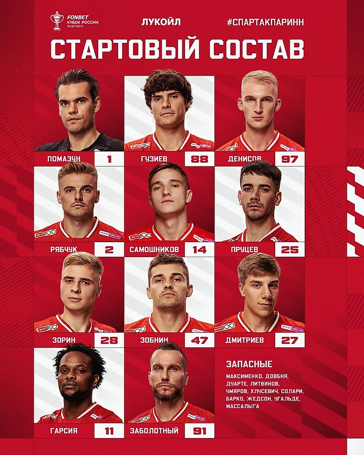 «Спартак»: Помазун, Денисов, Гузиев, Рябчук, Гарсия, Пруцев, Зобнин (к), Зорин, Самошников, Дмитриев, Заболотный