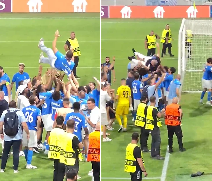 А «Пафос» бурно отпраздновал выход в общий этап прямо на поле, это показал у себя в телеграм-канале Андрей Бодров. Сначала игроки подбрасывали российских руководителей.