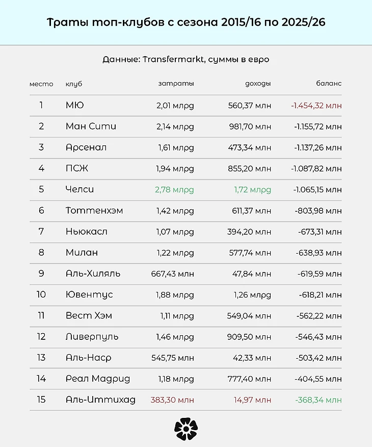 Здесь лондонцы ожидаемо выходят в лидеры по чистым тратам, немного опережая всё тех же «МЮ» и «Арсенал». Однако, победа на КЧМ если не с лихвой, то как минимум частично оправдала вложенные средства.