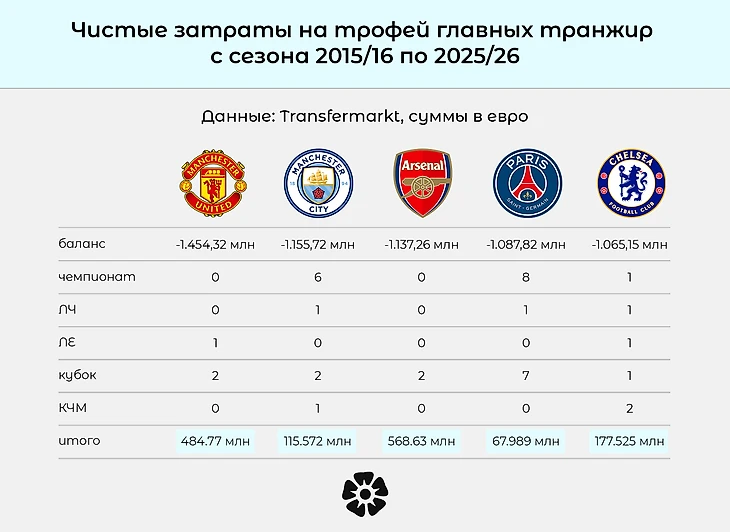 По «Сити» и парижанам вопросов нет, у «Челси» все тоже неплохо: каждый трофей обошелся менее чем в 200 млн. А вот у «Арсенала» и «Юнайтед» заметные проблемы: потратив на двоих 2,5 миллиарда евро, они завоевали лишь четыре кубка Англии и одну Лигу Европы. К счастью, хоть здесь канониры на первом месте — trust the process, как-никак.