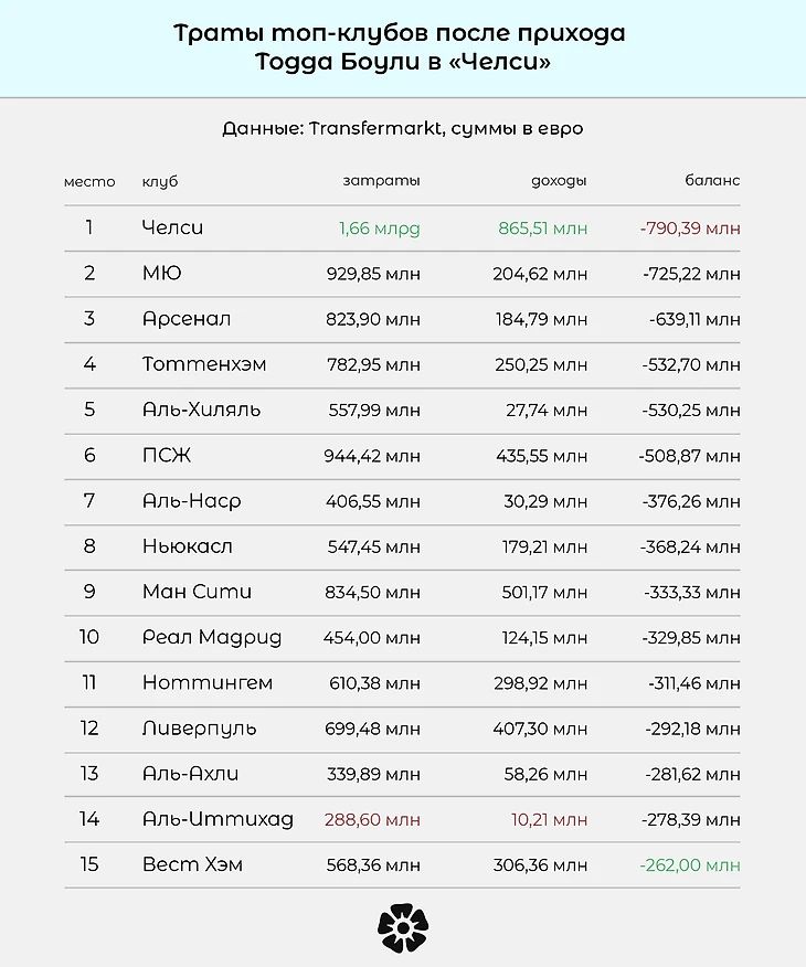 Понимаю, что основной спич про расточительность «Челси» начался именно после приобретения клуба Тоддом Боули. Поэтому отдельно посмотрим на эту же таблицу, но только в его эпоху.