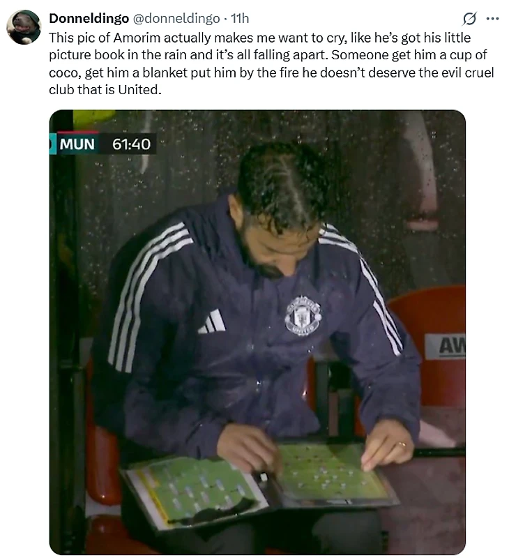 💭 «От этой фотографии Аморима мне просто хочется плакать. Он сидит с этой маленькой тактической книжкой под проливным дождем, но все равно все разваливается на части. Кто-нибудь, принесите ему чашку какао, одеяло, посадите его у камина, он не заслуживает такого жестокого клуба, как «Юнайтед».