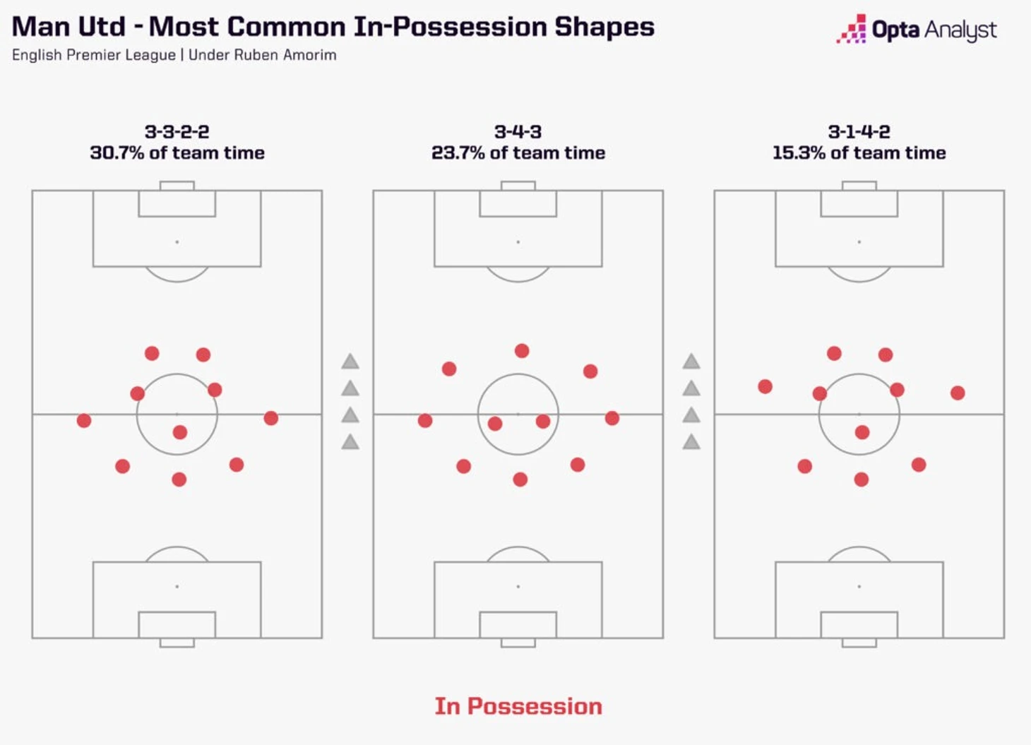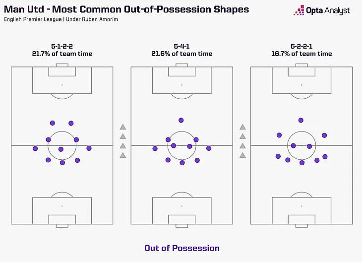 «Юнайтед» выходил в расстановке 3-4-2-1 в 93,1% матчей лиги под руководством Аморима. С начала прошлого сезона лишь три менеджера (при условии 10+ игр) использовали одну схему в большей доле матчей. Разница в том, что трое вышеупомянутых тренеров выиграли как минимум 40% своих матчей в Премьер-лиге с начала сезона 2024/25, тогда как его процент побед составляет всего 24,1%.