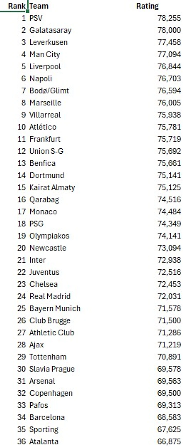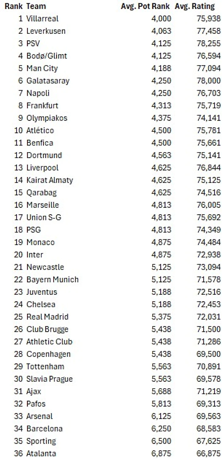 В четверг, 28 августа прошла жеребьевка «общего», как его называет сайт УЕФА, этапа Лиги Чемпионов. Кому повезло в этой жеребьевке, а кому нет? Раньше, на групповой стадии, можно было достаточно легко определить «группы смерти» и достаточно проходные группы и примерно понять, кто же пройдет дальше. Теперь у каждой из 36ти команд по сути своя «группа» и кому достались соперники попроще а кому посильнее определить трудно. Но ответить на этот вопрос можно, если, например, ориентироваться на рейтинг УЕФА. Если просто взять средний рейтинг соперников, то получится, что самые сильные соперники у ПСЖ, Галатасарая и Байера, а самые слабые у Аталанты, Спортинга и Барселоны: