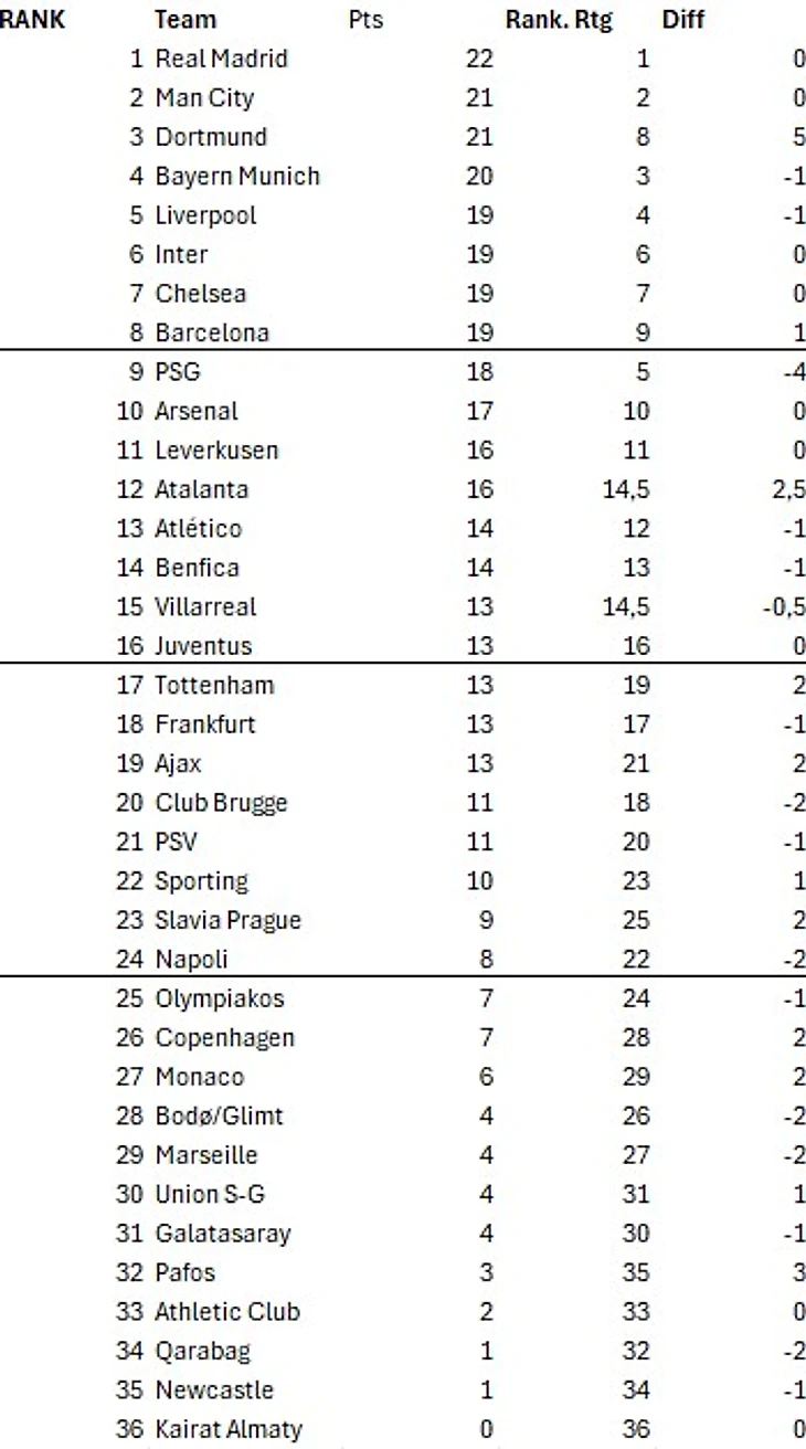 При равенстве средних мест соперников в корзине я расставил команды опять же по среднему рейтингу соперников. По этой таблице заметнее, что в счастливчиках оказался и Арсенал. Интересно, что им с Барселоной достались 3 одинаковых сравнительно простых соперника: Олимпиакос дома и Славия и Брюгге в гостях. При этом Арсеналу достался еще и Кайрат, что на бумаге делает его выход в плей-офф (а то и сразу в 1/8) делом практически решенным. Сравнительно повезло еще и Пафосу - во многом из-за того же Кайрата с почти нулевым рейтингом. Впрочем, поможет ли это им с выходом в плей-офф, вопрос сомнительный.