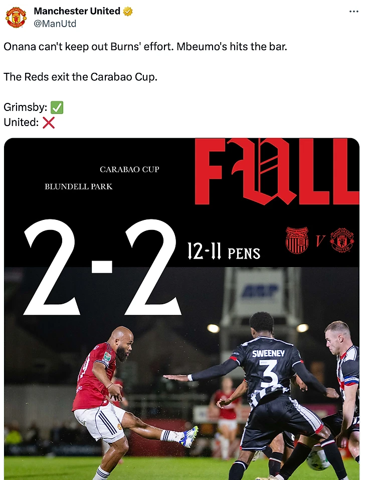 Первым словом в посте о поражении клуба в матче с «Гримсби Таун» был Онана. «МЮ» уточнил, что Андре не сумел отбить последний удар в серии пенальти, а Бриан Мбемо пробил в штангу. Немного жестокая формулировка, не думаете?