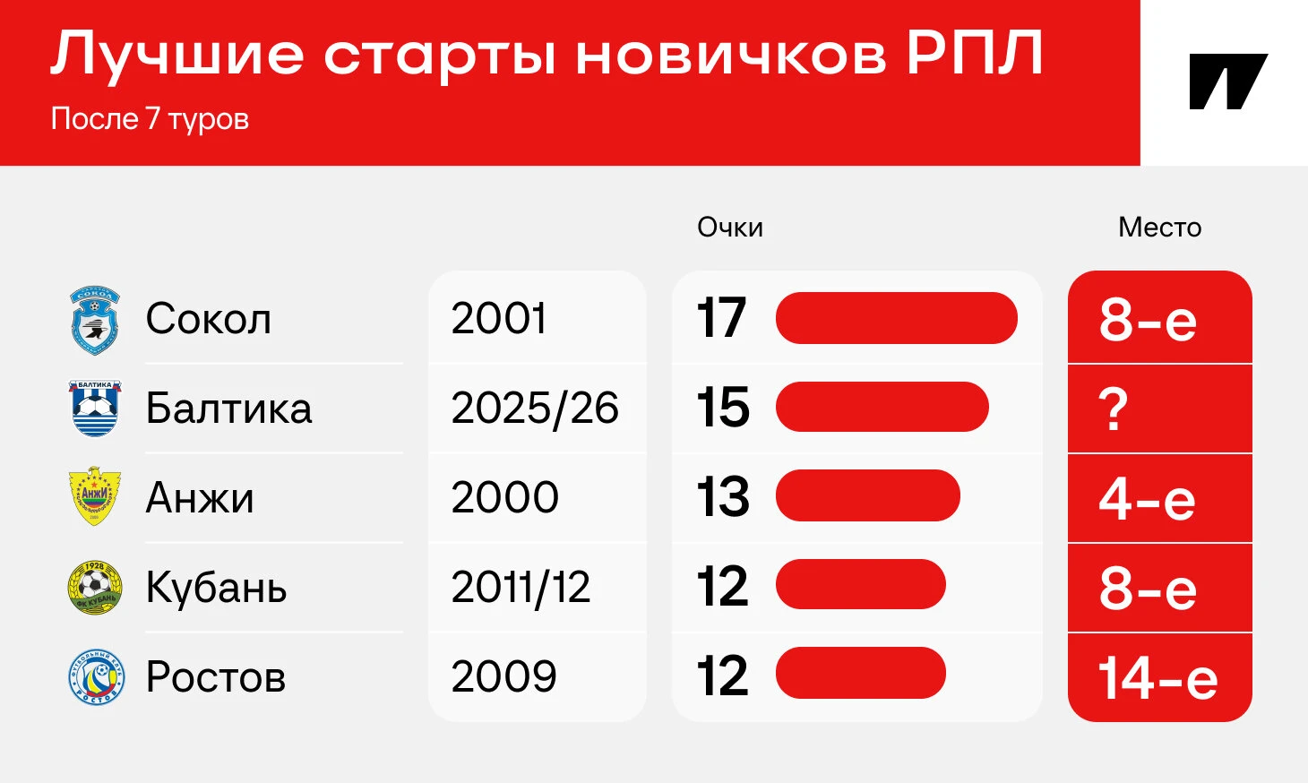 Калининградцы вообще выдали лучший старт в истории Премьер-лиги среди новичков – если смотреть с момента переименования чемпионата России в 2002 году. До этого лучший старт принадлежал «Кубани» в сезоне-2010/11 – после семи туров у них было 12 очков. У команды Дана Петреску был не самый сложный календарь – из грандов обыграли только «Спартак».