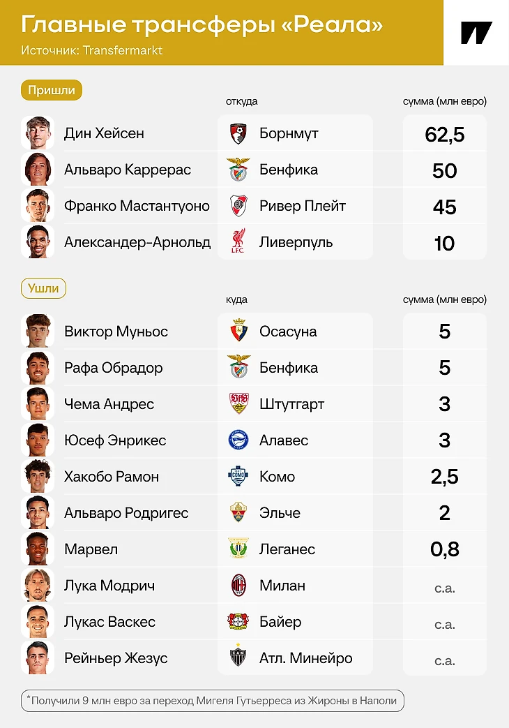 При этом «Мадрид» вновь придерживался финансовой рациональности – старались сильно не переплачивать. За лето потратили 167,5 млн евро и заработали 30,3 – преимущественно за счет продажи 50% прав на игроков кантеры. Например, 9 млн евро прилетели за переход Мигеля Гутьерреса из «Жироны» в «Наполи» (как раз 50% процентов).