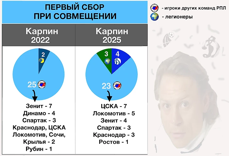 За год у «Наших парней» пять сборов - это полтора месяца! Недаром, по информации «РБ Спорт», «Зенит», «Спартак» и «Локо» ругали совмещение на собрании РПЛ. Аргументы: тревога за результаты сборной (похвально) и «несправедливое преимущество» для бело-голубых. Последний пункт не объяснялся. Может, беспокоились, что Карпин в отличие от коллег будет непрерывно работать с русским костяком «Динамо»? Вряд ли. Отъезды тренера и деление состава, наоборот, вредны.