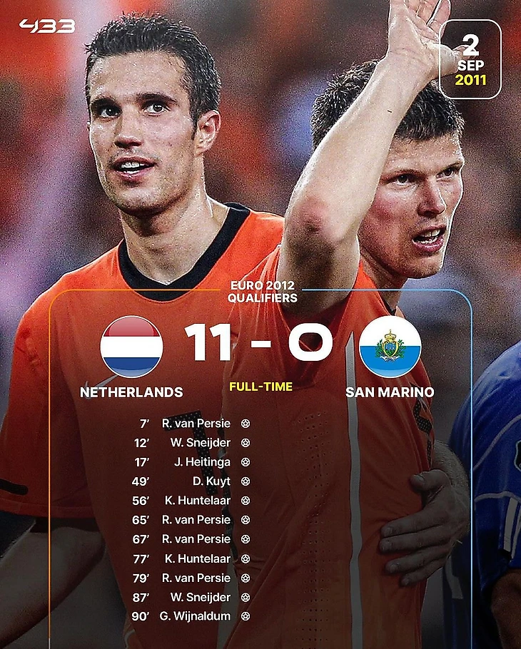 На днях тут всплыло фото, в честь 14 летия разгромной победы Нидерландов над карликовой сборной 11:0. Сразу пошли разговоры, что вот Ван Перси 5 мячей забил Сан-Марино 🇸🇲 , еще и Хунтелар 2 гола положил, набили себе статистику на мусорных сборных
