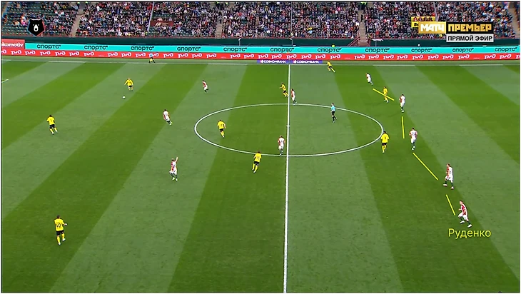 В итоге гол Рахмановича пришел из неслаженного перестроения «Локо»: Руденко еще не вернулся назад на своем фланге, а оборона уже растянулась по ширине. Морозов ушел направо за Джимми Марином, а Монтес не успел заузить. Этим воспользовался Раков.
