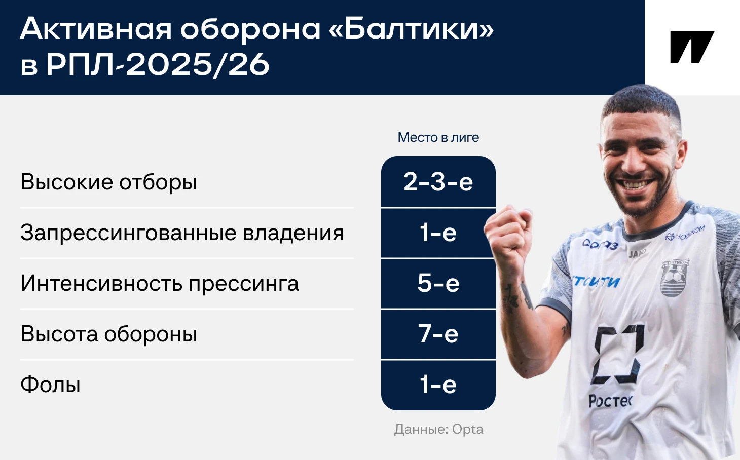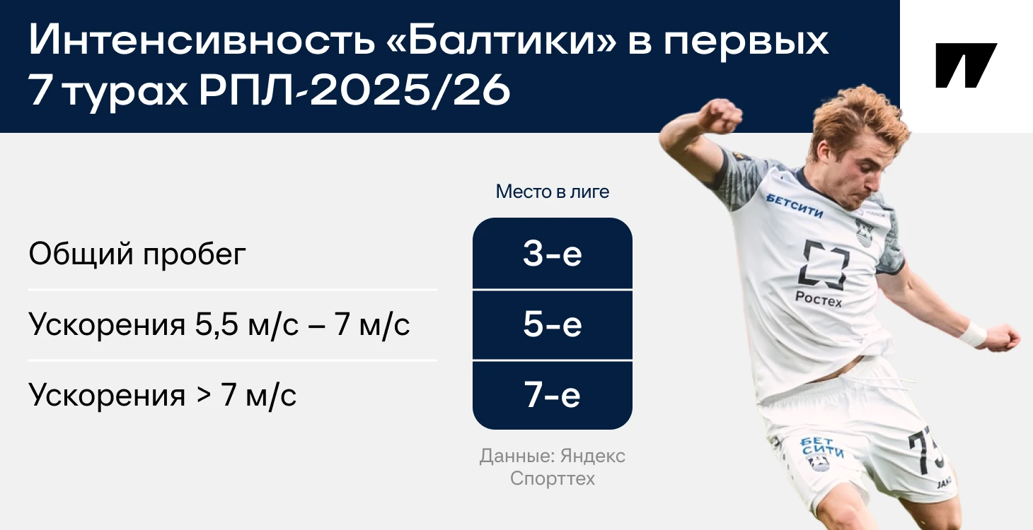 2. Интенсивность. «Балтика» – одна из лучших в РПЛ по спринтам и общему пробегу. За счет этого тянет энергозатратный футбол с быстрыми переходами, работой на подборе, движением за спину и в недодачу.