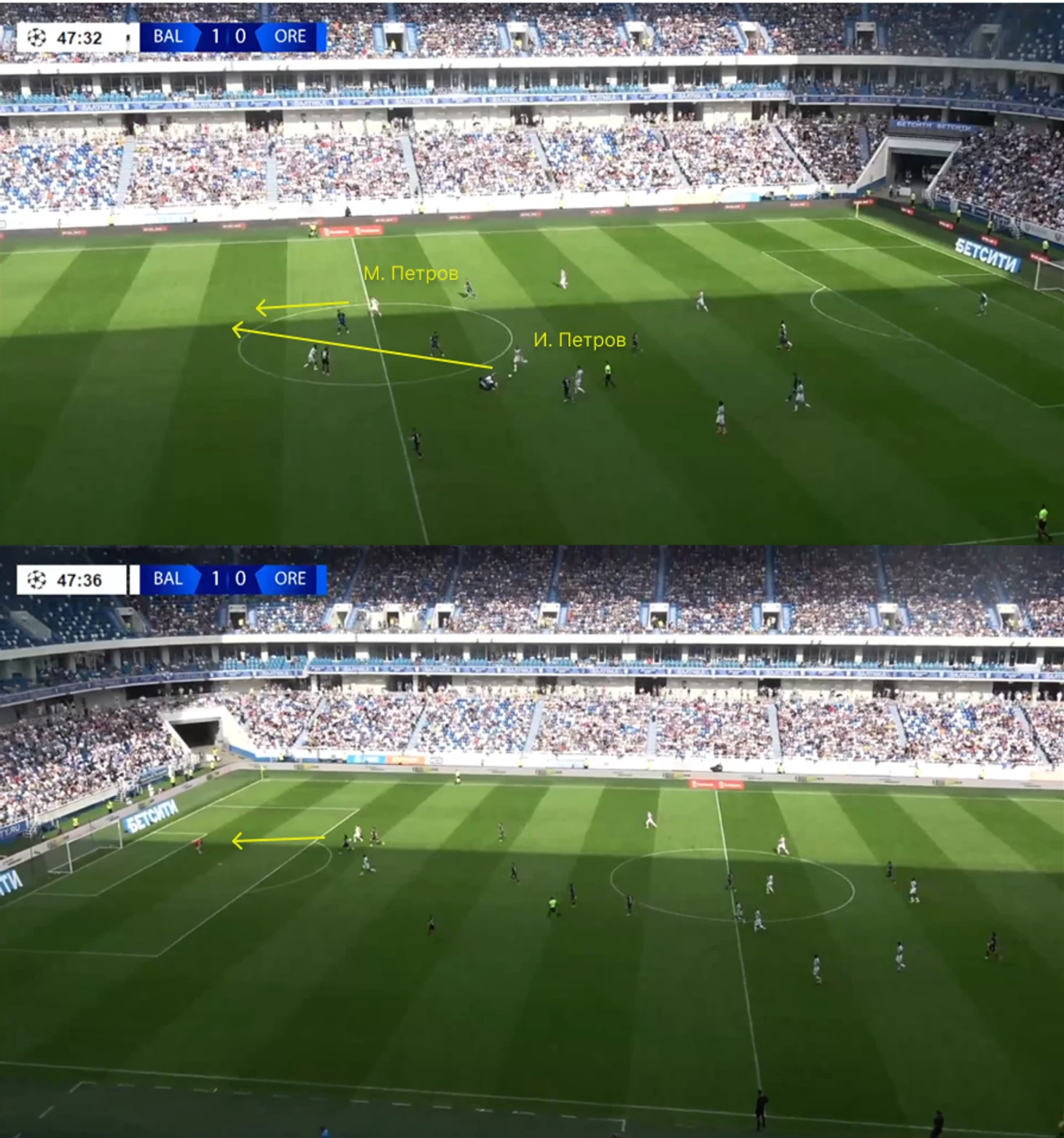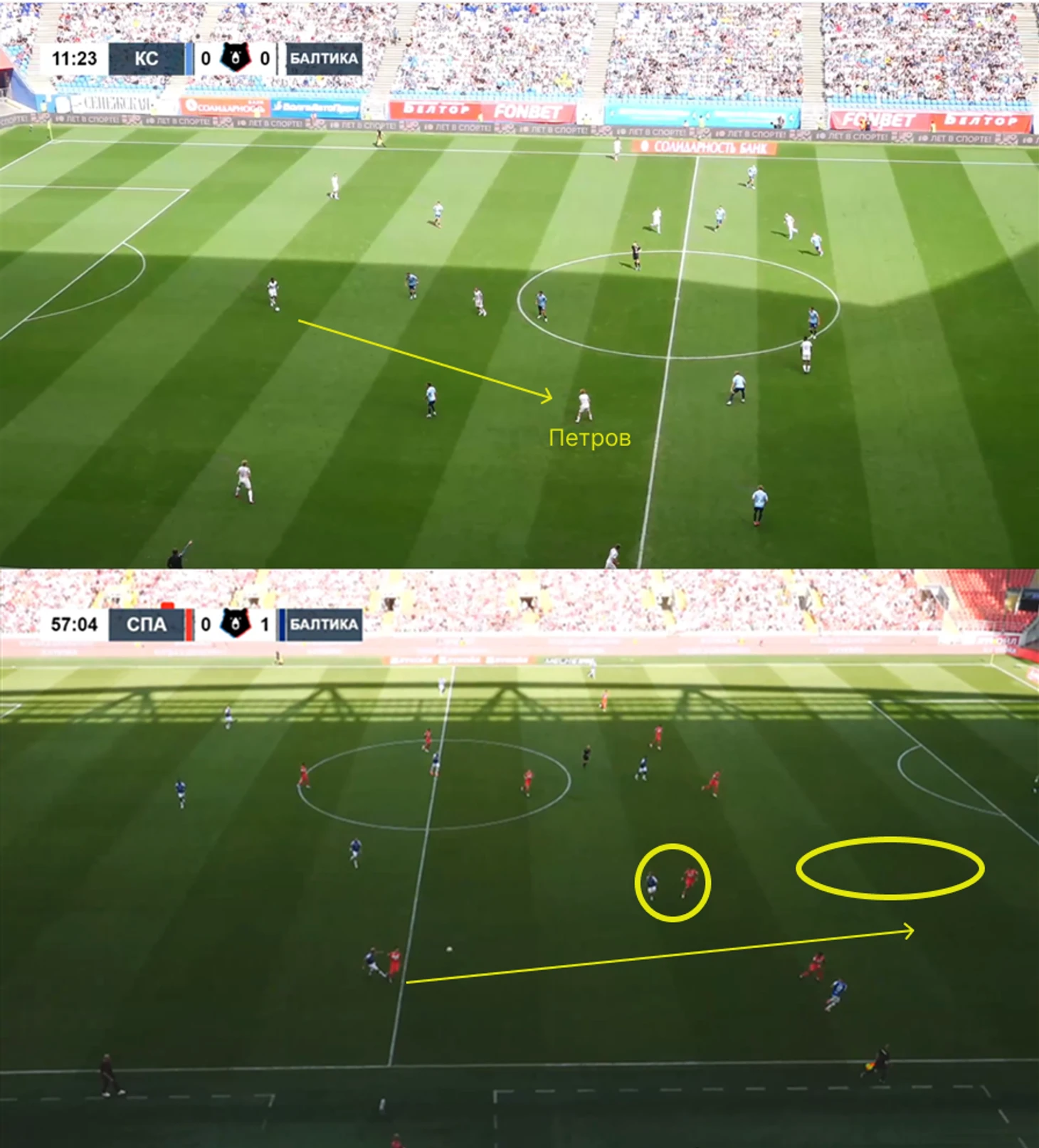 Когда «Балтике» приходится комбинировать, она делает это максимально вертикально. Решает интеллект Максима Петрова, который отскакивает в полуфланг под центральных защитников. Дальше либо удается перегрузить середину и обострить, либо вытянуть за собой центрального защитника и открыть пространство за спиной для Владислава Сауся.
