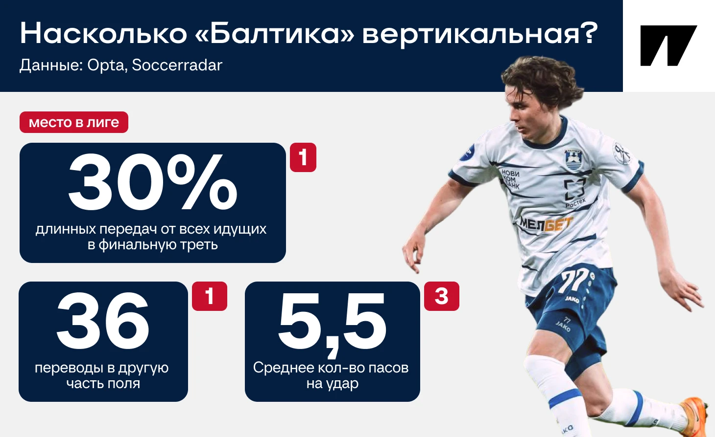 Еще немного про вертикальность. «Балтика» стремительно забрасывает вперед длинными передачами, вскрывает свободную зону диагоналями Петровых в другую часть поля. В РПЛ меньше передач для удара требуется только «Рубину» и «Махачкале».