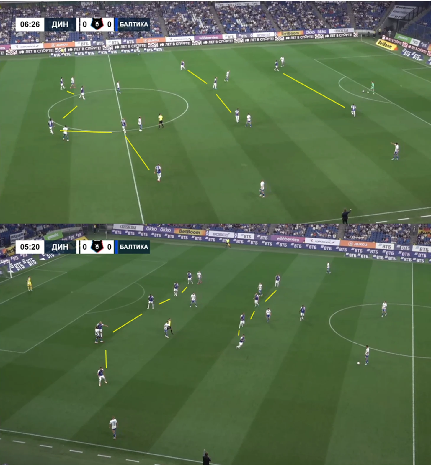 1. Гибкий прессинг. «Балтика» дисциплинированно переключается между 5-4-1 в среднем блоке и 5-3-2 при давлении. Вторым нападающим становится правый инсайд, а левый садится глубже и заужает к центру. Основной принцип – жесткая персоналка и превосходство 1 в 1. Внешние ЦЗ Сергей Варатынов и Натан Гассама следят за спусками в глубину и играют до упора, страхующий центральный Кевин Андраде доминирует вверху и играет на опережение, центральные полузащитники борются на подборе.