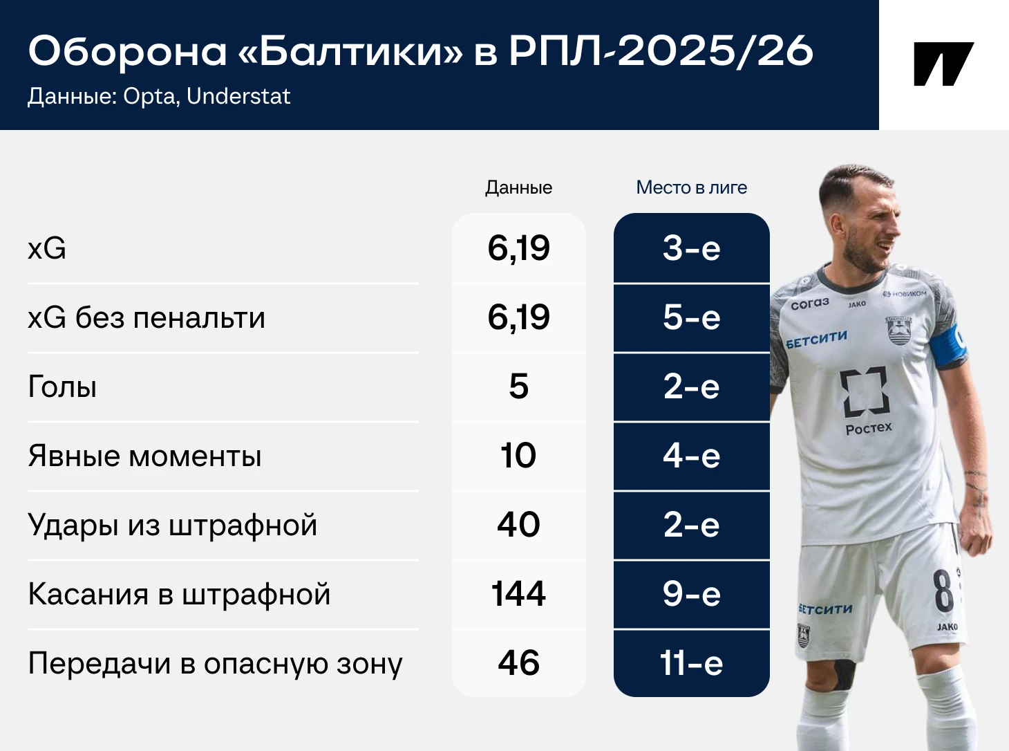 Еще один сюрприз: у Талалаева одна из самых надежных оборон в лиге. Негативный момент: «Балтика» часто позволяет соперникам заходить в штрафную. Позитивный: благодаря классной подстраховке от центральных защитников прямой угрозы оттуда практически нет.
