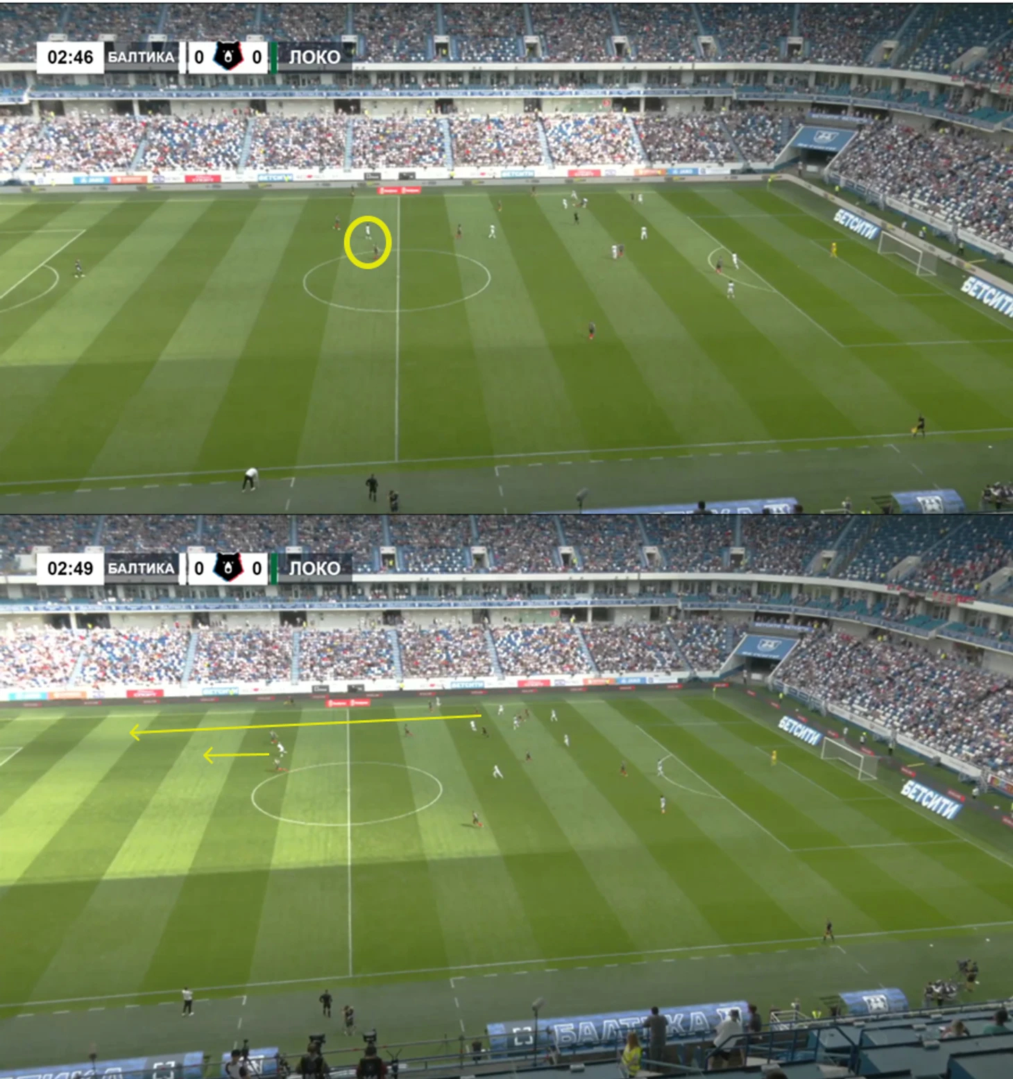 3. «Балтика» всегда готова атаковать глубину. Во-первых, за счет грамотного расположения в зоне подбора – так удается быстро возвращать владение. Во-вторых, благодаря позиции Хиля, который не опускается за мячом, а связывает защитников у центральной линии. В момент перехода владения «Балтика» получает лишнее пространство для разгона, а Брайану – легче сразу стартовать за спину.