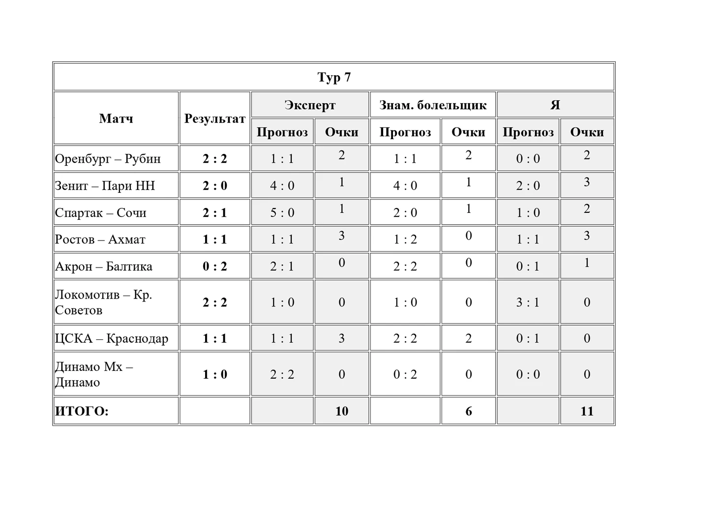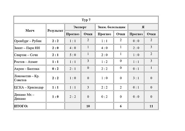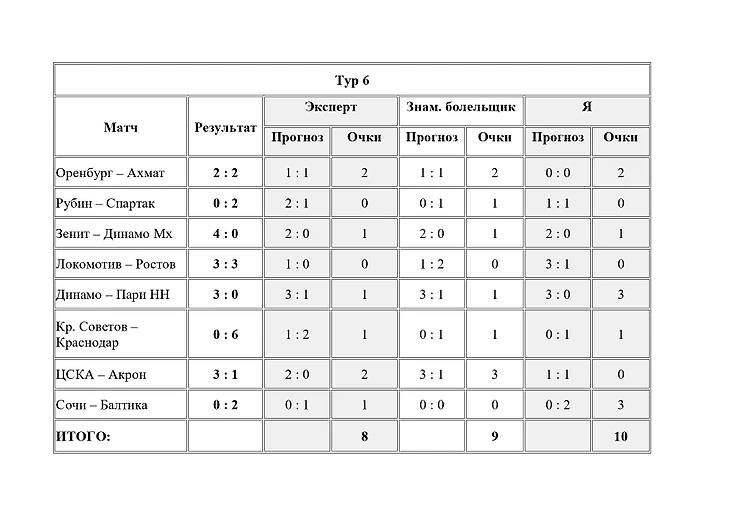 Вот например результаты прогнозов на игры 6 тура: