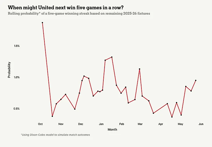 Неудивительно, что модель не даёт особо оптимистичных прогнозов. Вероятность того, что «Манчестер Юнайтед» выиграет пять матчей подряд в лиге, редко превышает 1%. Наибольшая вероятность наблюдается в их текущей серии — несмотря на то, что в ней есть «Манчестер Сити» и «Челси» — потому что благодаря победе на прошлой неделе в домашнем матче с «Бёрнли» им теперь нужно на одну победу меньше. В декабре наблюдается небольшой пик, совпадающий с периодом, который выделяет Илетт, но модель показывает, что январь, скорее всего, может быть самым удачным месяцем.