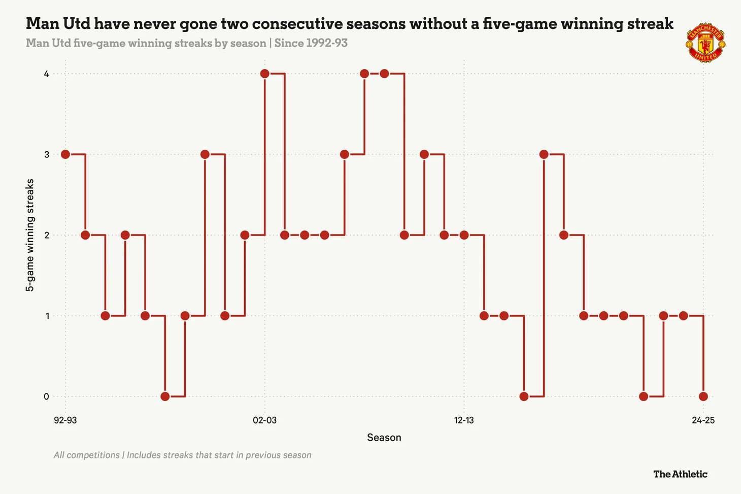 Исторически так вышло, что для подобного эксперимента «Манчестер Юнайтед» был самым надёжным выбором. В общей сложности у них было 58 серий с пятью подряд победами и, хотя после ухода сэра Алекса Фергюсона они, безусловно, переживают более тяжёлые времена, у них никогда не было двух сезонов подряд без такой серии.