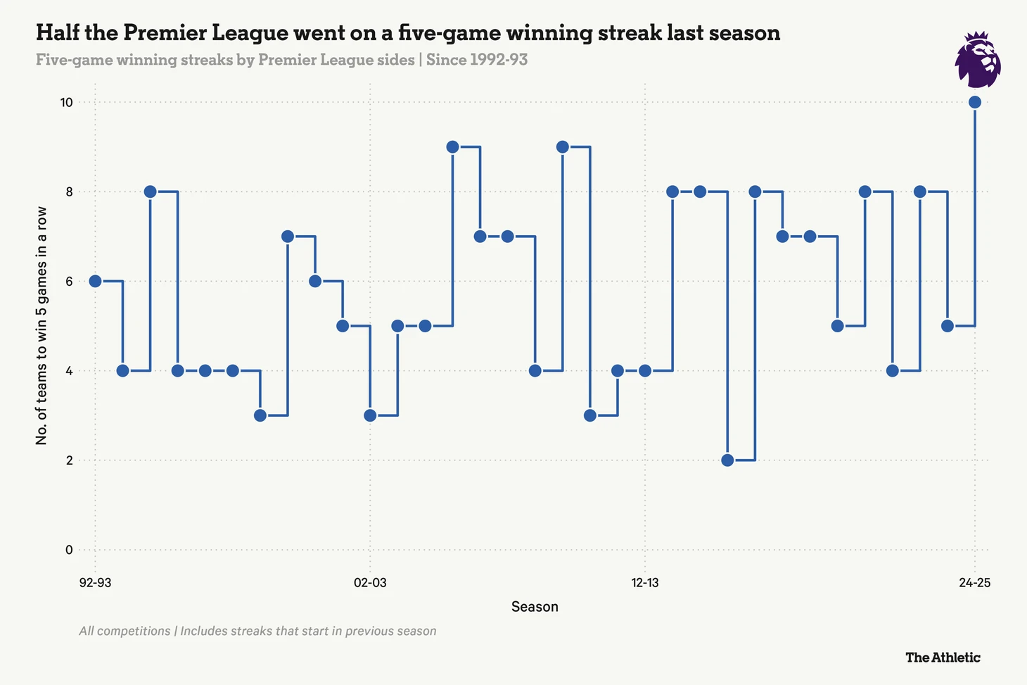 И хотя наличие топ-тренера или сильной команды помогает добиваться одной победы за другой, это не является основополагающим фактором. Тот факт, что «Тоттенхэм» и «Вулверхэмптон» сумели добиться этого в прошлом сезоне, несмотря на то, что финишировали ниже «Манчестер Юнайтед», а занявший второе место «Арсенал» этого не смог, подчеркивает чисто случайный характер такого достижения.