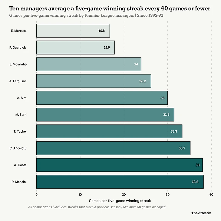 Несмотря на эту редкую засуху, Фергюсон одерживал пять побед подряд в среднем примерно каждые 26 матчей, что ставит его на четвёртое место среди тренеров Премьер-лиги. По случайному совпадению, трое тренеров в этом Топ-5 - лысые, где лидируют Энцо Мареска и Пеп Гвардиола, а Арне Слот замыкает пятёрку лидеров.