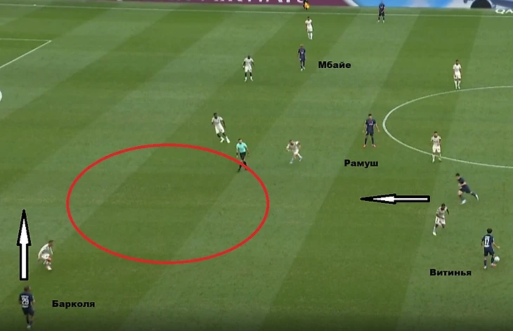 Рамуш – «ложная девятка»: Нападающий нередко уходил вглубь поля, освобождая пространство для рывков с третьей линии. Это было видно по выходу Мбайе, который получал освободившуюся зону для атаки. Без мяча Гонсалу был очень полезен, но с мячом в штрафной ему катастрофически не хватало точности.