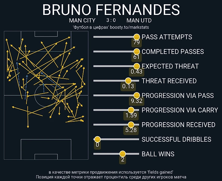 Единственным игроком «Юнайтед», кто раскрылся по такой игре, стал Бруну Фернандеш. Его можно критиковать за что угодно, в том числе и за недоработку в 1 голе «Сити», но за действия на мяче, когда «МЮ» играет с преимуществом критики португалец точно не заслуживает. Вчера он стал лидером своей команды в практически каждом показателе на мяче.