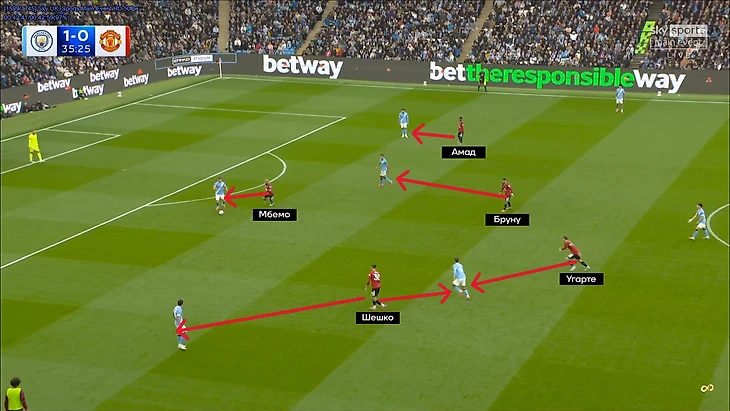 Однако вопреки такой оборонительной схеме на своей половине, от прессинга «МЮ» не отказывался. Именно этот баланс между низким блоком и агрессивным высоким прессингом «красные дьяволы» попытались перенять у «Тоттенхэма», который пару недель назад полностью переиграл «горожан» на «Этихаде».