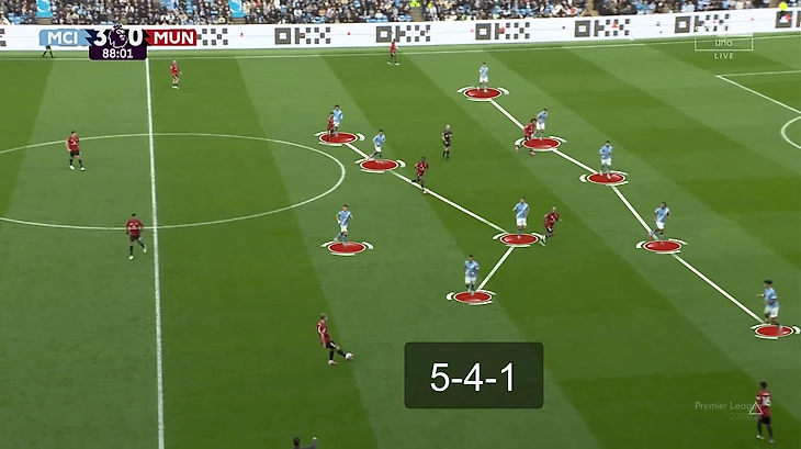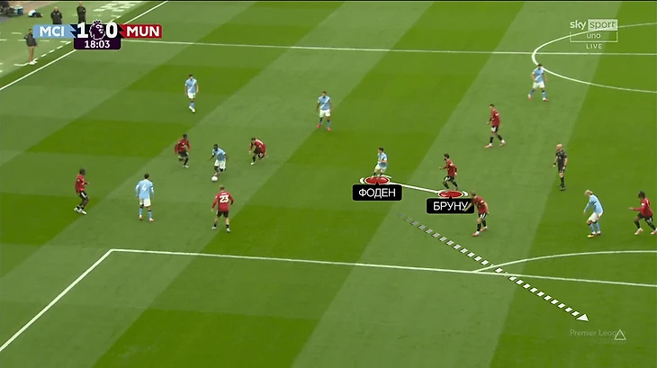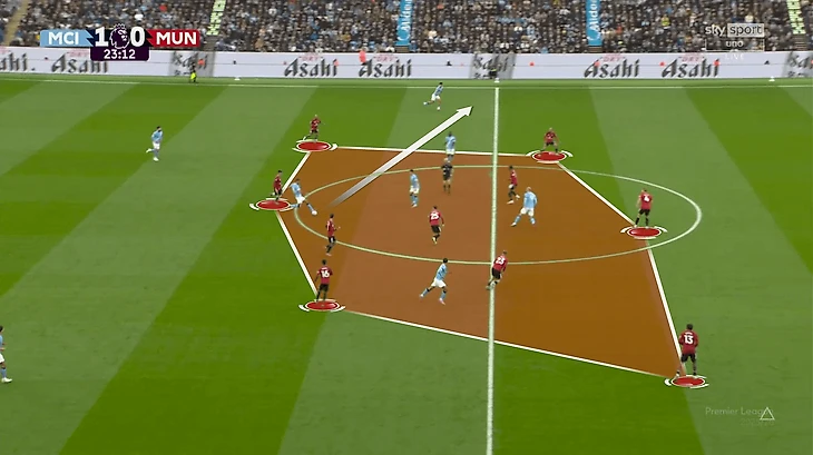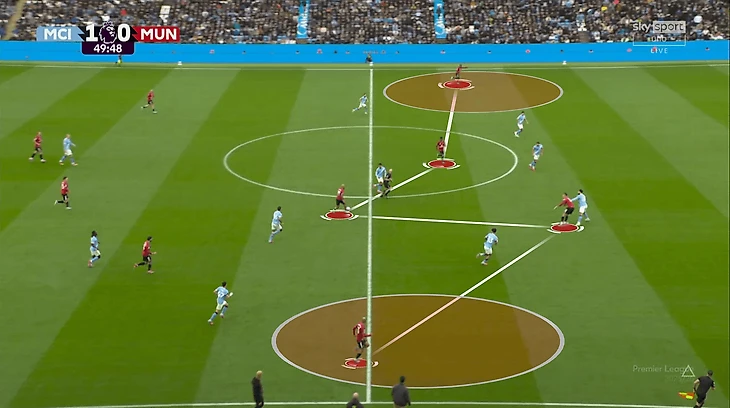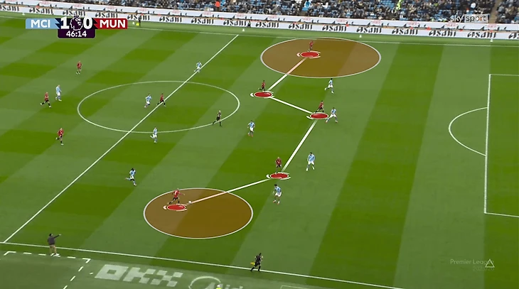 У «Юнайтед» не получалось накрыть всех сразу. В эпизоде с первым голом хозяев было сразу две неудачные попытки – сначала на чужой половине, потом на своей. Передача соперников друг другу тоже страдала. Химии особенно недоставало опорникам и тройке ЦЗ. Вот показательный эпизод – команда сбивается в кучу, но это никак не помогает затруднить Родри продвижение мяча: