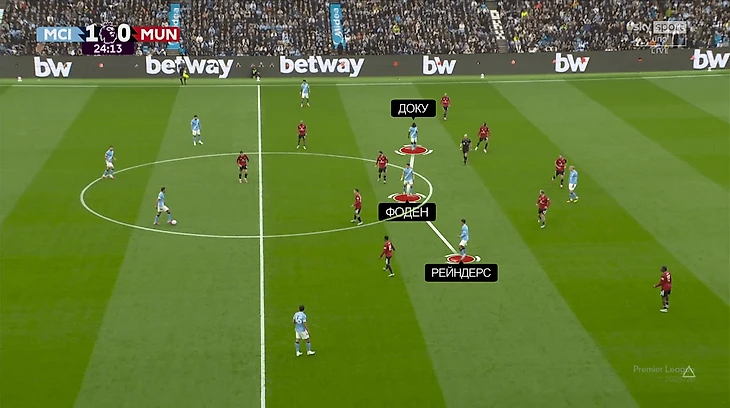 Вне зависимости от наполнения главная цель – перегрузить опорную «МЮ», которая состоит только из пары Бруну – Угарте. На бумаге – соотношение 3-в-2 в пользу «Сити». Чтобы это соотношение регулярно работало, требовалась своевременная доставка мяча. С ней тоже не было проблем. Помогло возвращение Родри (второй старт подряд) и Йошки Гвардиола (первый) – важнейших игроков с точки зрения первого паса.