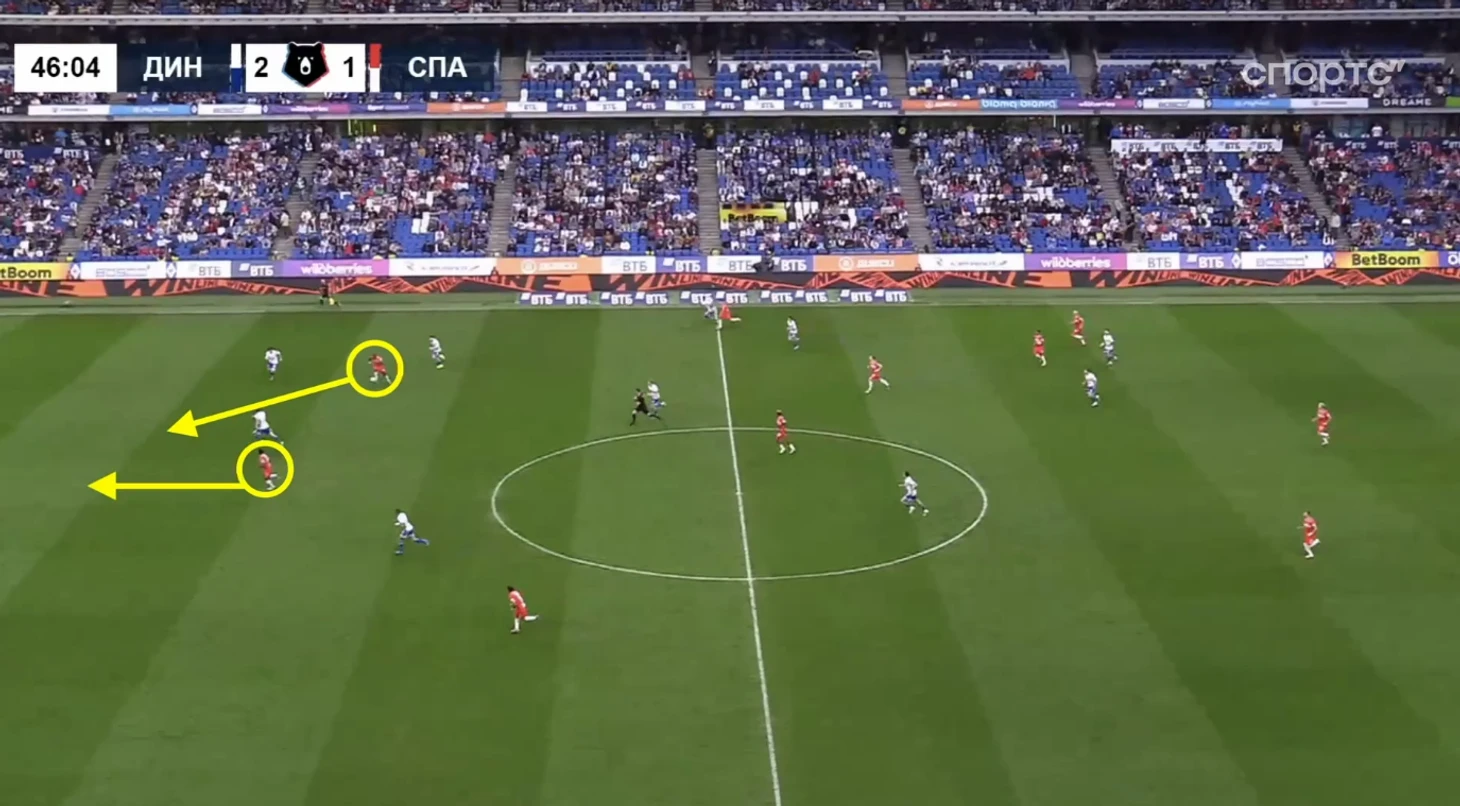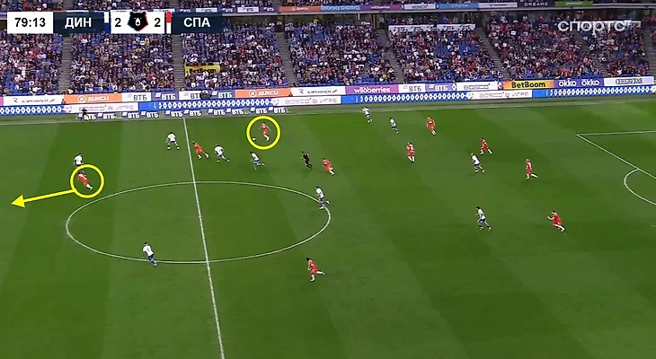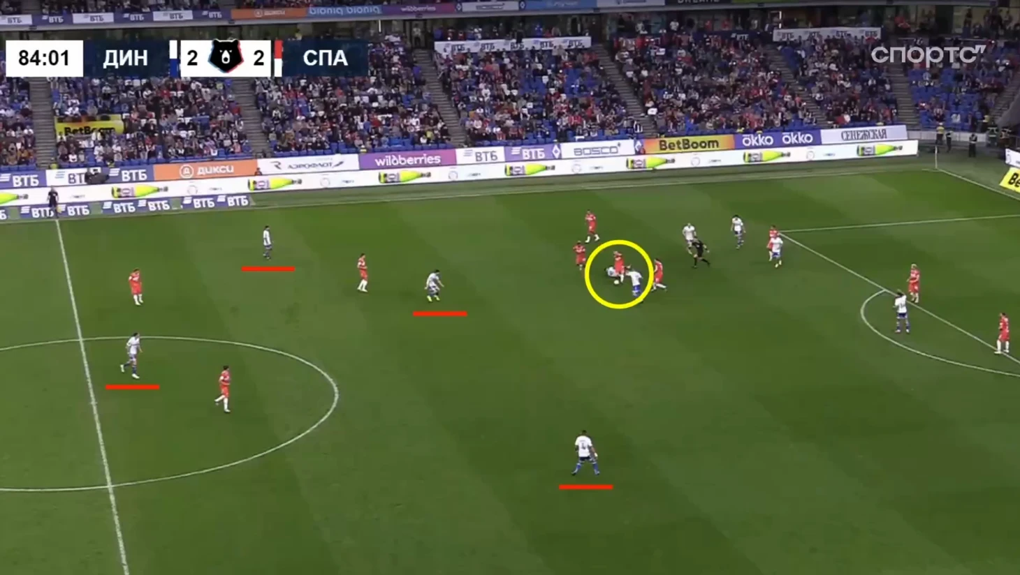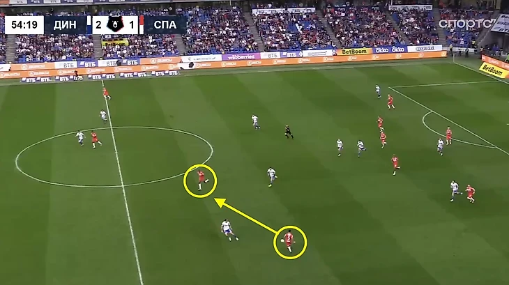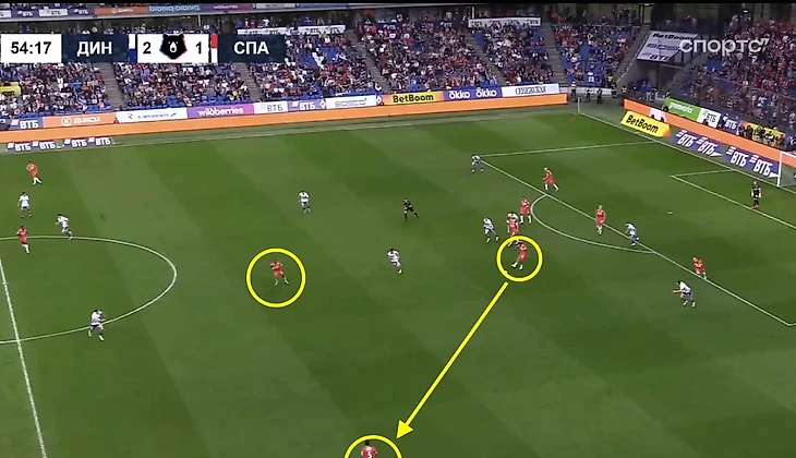 Если бы «Динамо» было хорошо расположено, они могли бы вступить в быстрый отбор. Сейчас не было шансов контрпрессинговать, потому что игроки, которые не участвовали в атаке, были не в тех позициях. «Спартак» опять вываливается в очень хорошую атаку – сколько пространства.