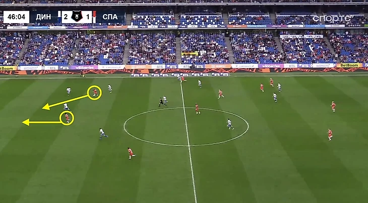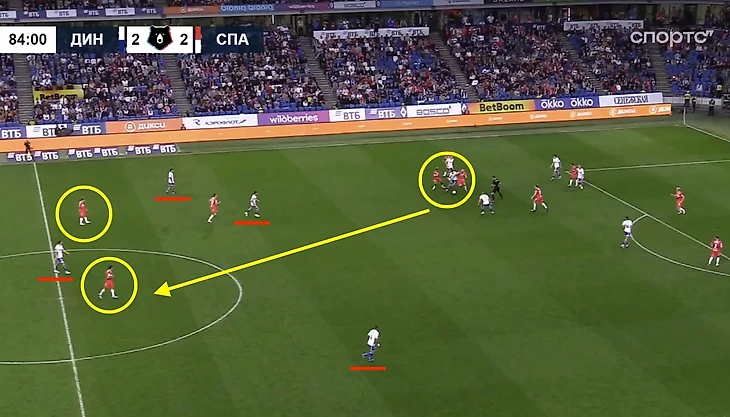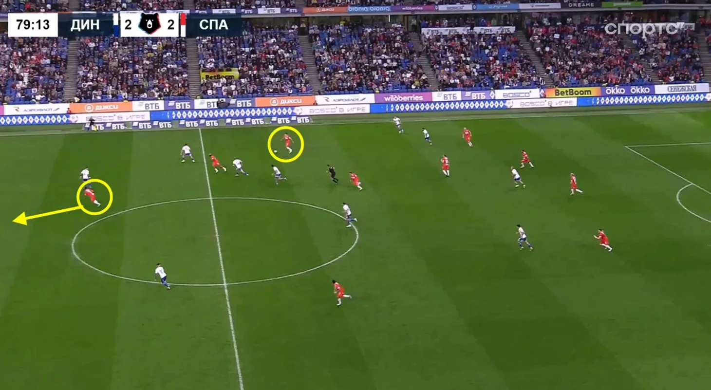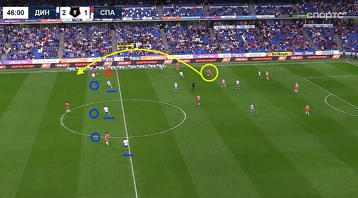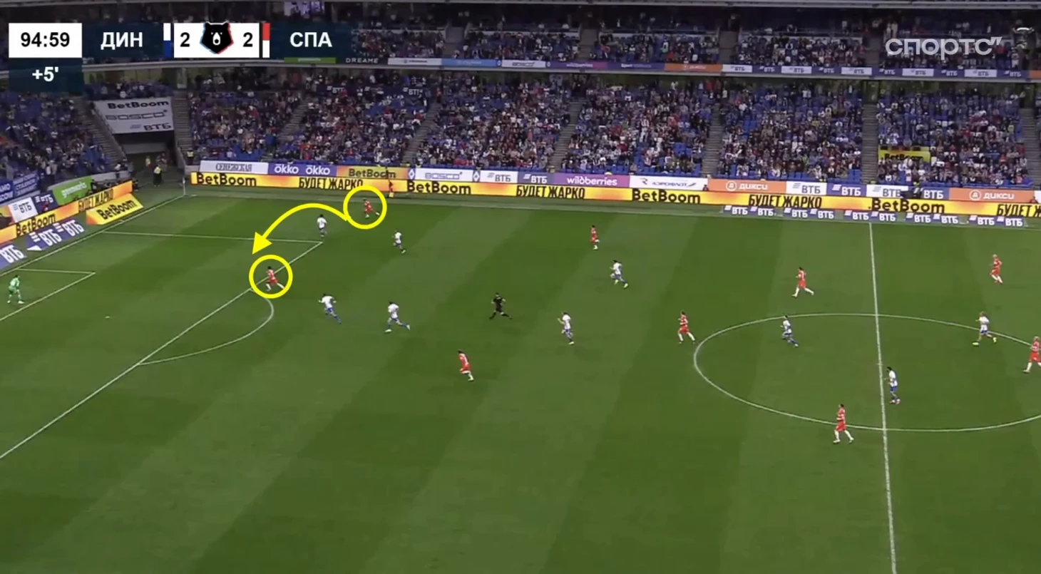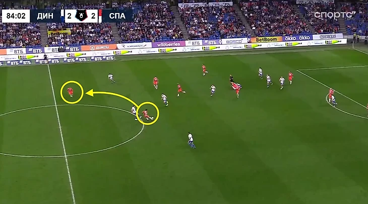 Если бы «Динамо» было хорошо расположено, они могли бы вступить в быстрый отбор. Сейчас не было шансов контрпрессинговать, потому что игроки, которые не участвовали в атаке, были не в тех позициях. «Спартак» опять вываливается в очень хорошую атаку – сколько пространства.